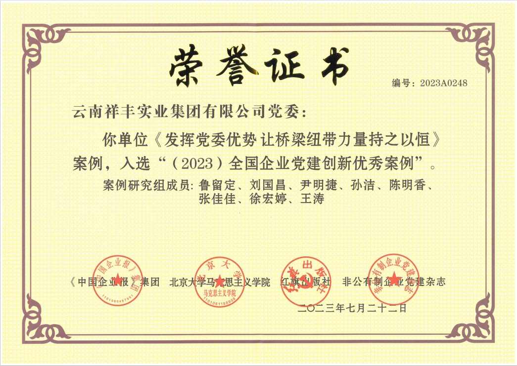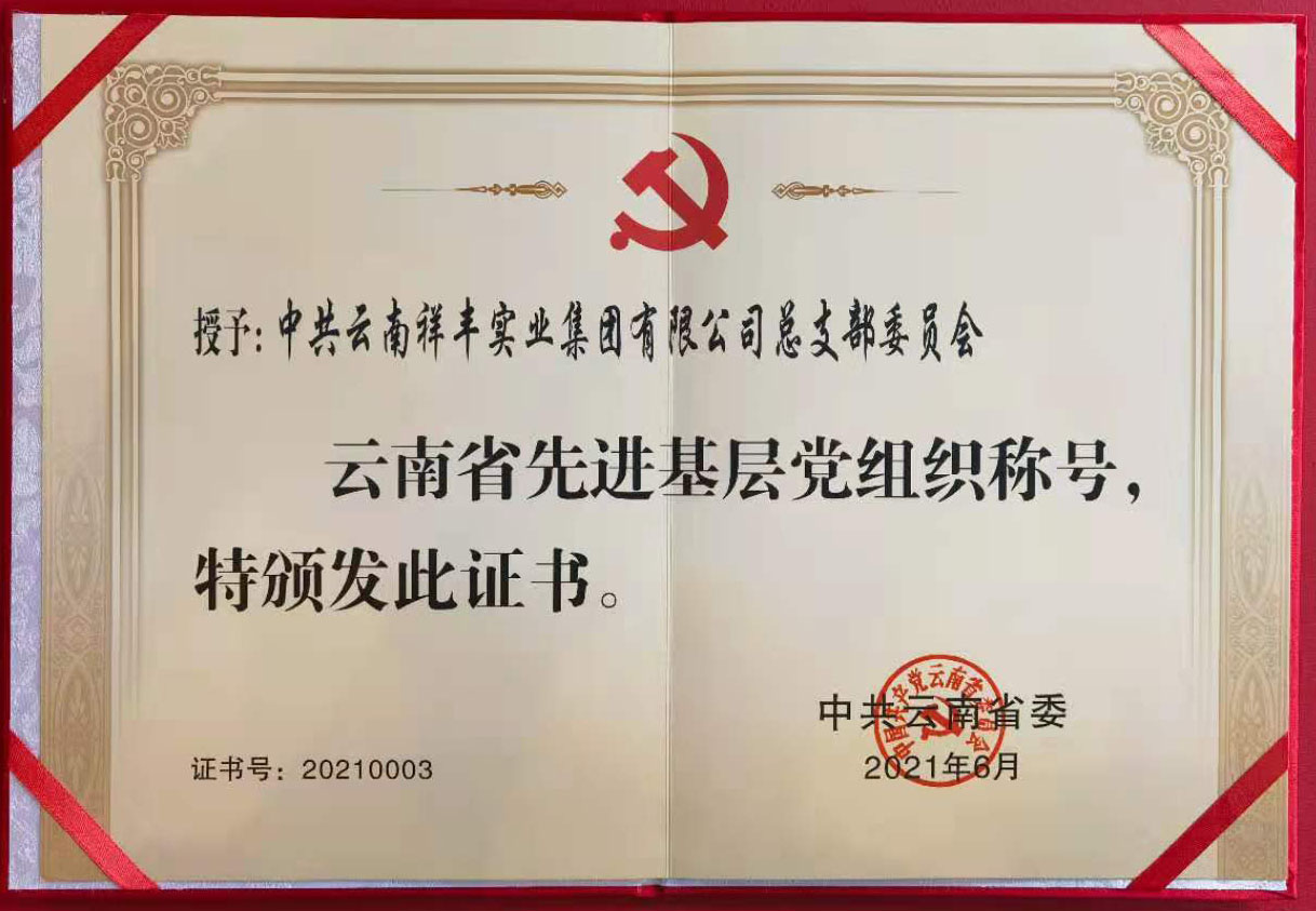 2013年7月,祥豐黨支部2011—2012年度"云嶺先鋒"工程被中共連然街道工作委員會(huì)評(píng)為"先進(jìn)基層黨組織";2013年7月,祥豐黨支部被中共安寧市委評(píng)為"基層黨建示范點(diǎn)";2013年7月,公司團(tuán)工會(huì)楊洪銘被推薦為"安寧市青年聯(lián)合會(huì)第二屆委員會(huì)委員";2013年7月,公司團(tuán)工委組織公司全體職工團(tuán)員青年開(kāi)展"愛(ài)心水窖"捐款活動(dòng),祥豐集團(tuán)
