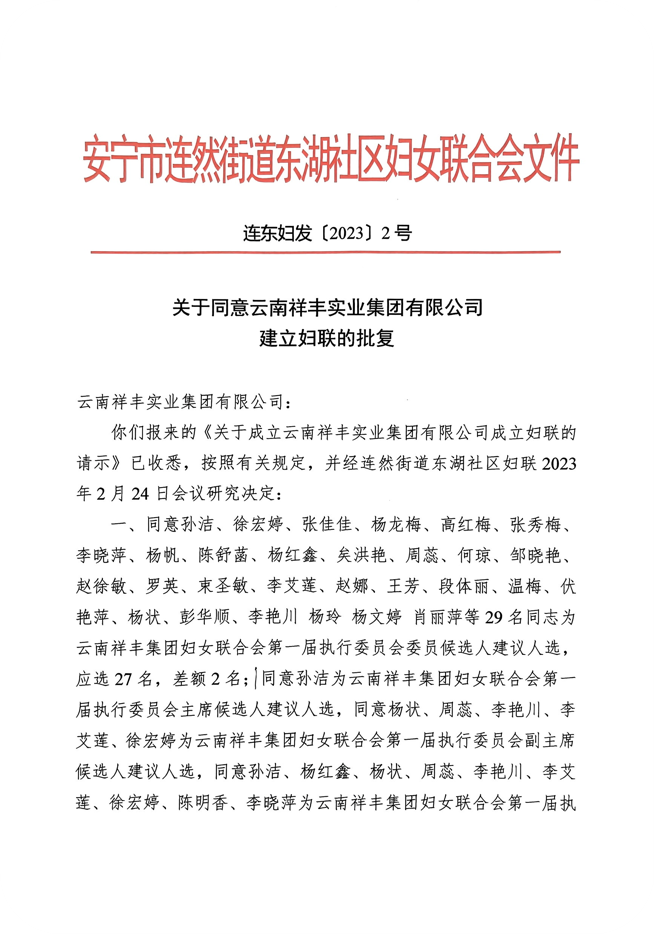 經(jīng)安寧市連然街道東湖社區(qū)婦女聯(lián)合會(huì)“聯(lián)東婦發(fā)[2023]1號(hào)”、“聯(lián)東婦發(fā)[2023]2號(hào)”文件批復(fù),云南祥豐集團(tuán)于2023年3月2日召開(kāi)婦女代表大會(huì),正式組建云南祥豐實(shí)業(yè)集團(tuán)有限公司婦女聯(lián)合會(huì)。